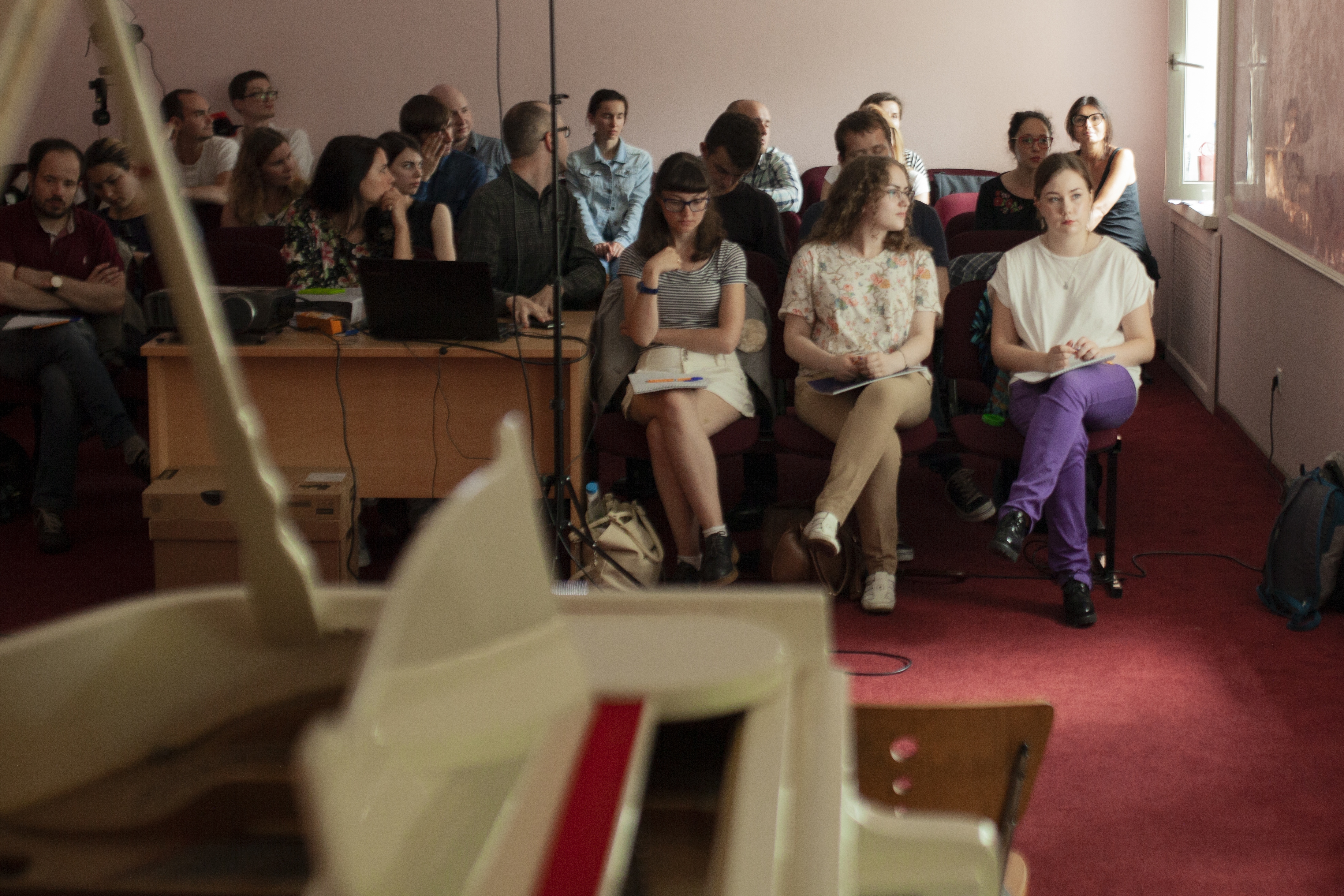 По сравнению с огненной радикалкой Настасьей Хрущёвой, сделавшей первый день «Композиторских читок», Юрий Васильевич предсказуемо выглядел традиционным хранителем профессии.