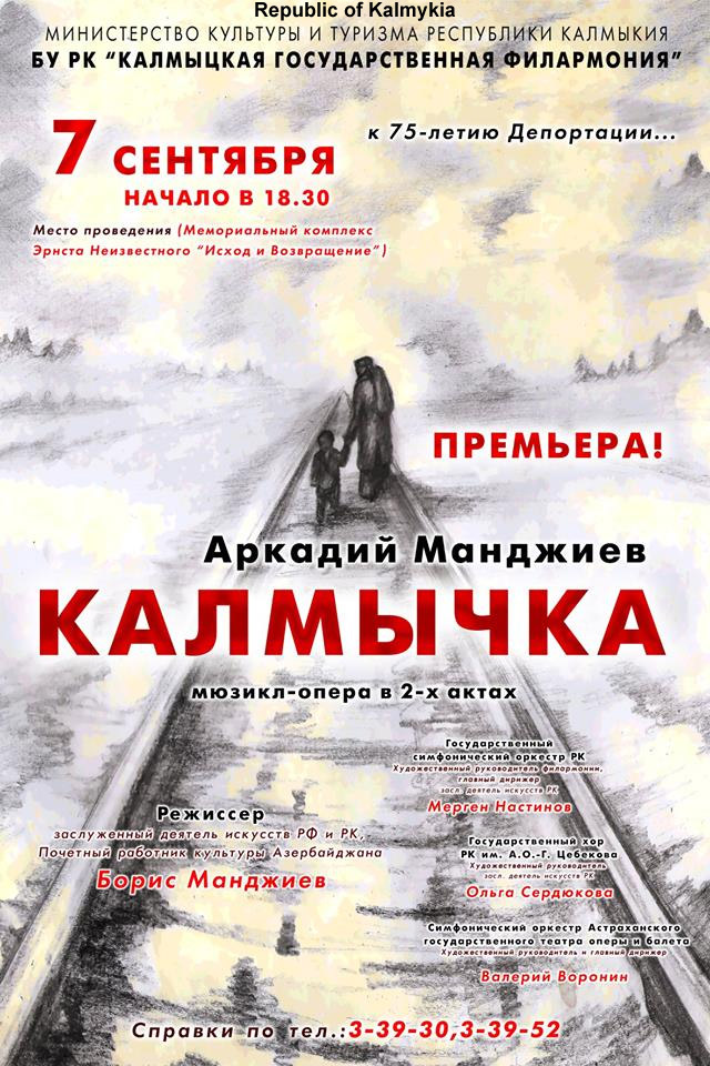 По замыслу композитора и режиссера сценической площадкой для премьеры мюзикла-оперы «Калмычка» станет мемориальный комплекс у памятника Эрнста Неизвестного «Исход и Возвращение». В столицу Республики приедут коллеги и музыканты из разных городов России, в том числе и артисты оркестра Астраханского театра оперы и балета (художественный руководитель В.В. Воронин).