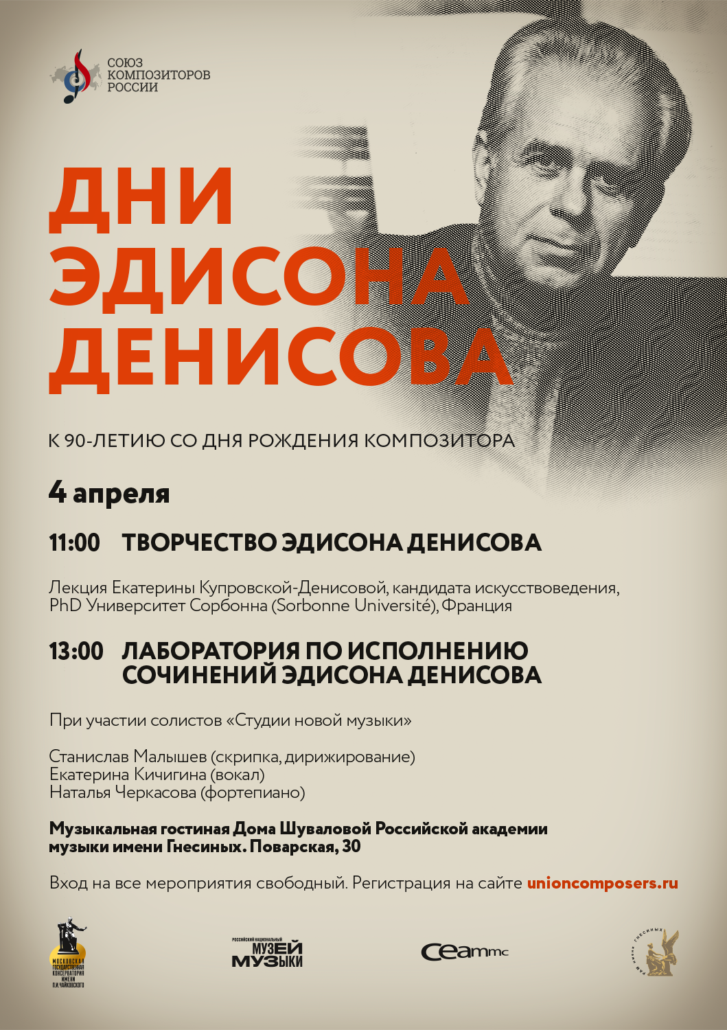 В Музыкальной гостиной Дома Шуваловой Российской академии музыки имени Гнесиных пройдет исполнительская лаборатория, посвященная сочинениям Эдисона Денисова. В рамках проекта Дни Эдисона Денисова солисты московского ансамбля «Студия новой музыки» Станислав Малышев (скрипка, дирижирование), Наталья Черкасова (фортепиано) и Екатерина Кичигина (вокал) в формате ридинг-сессий и мастер-классов поделятся опытом исполнения вокальных и камерно-инструментальных партитур с молодыми музыкантами.