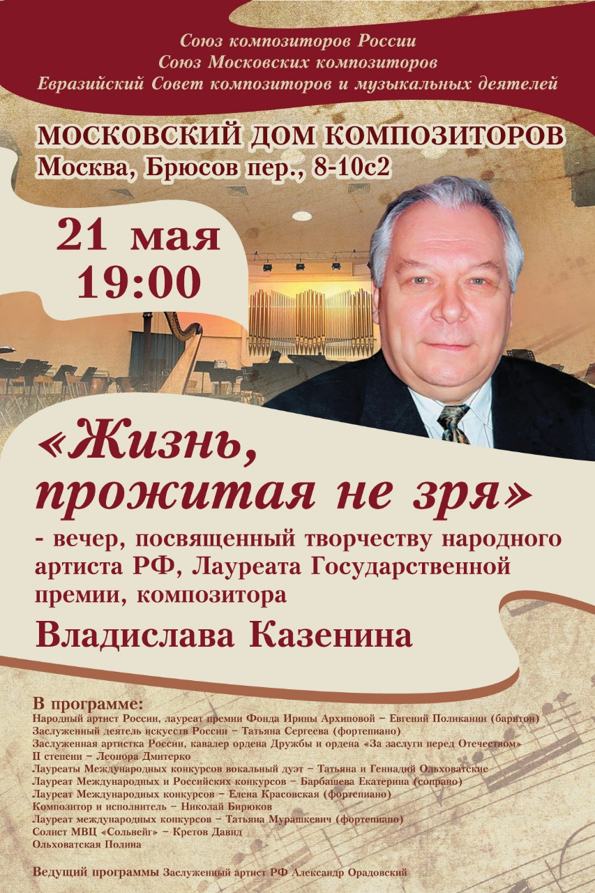 21 мая в Московском Доме композиторов состоится вечер памяти народного артиста РФ, лауреата Государственной премии, композитора Владислава Казенина.