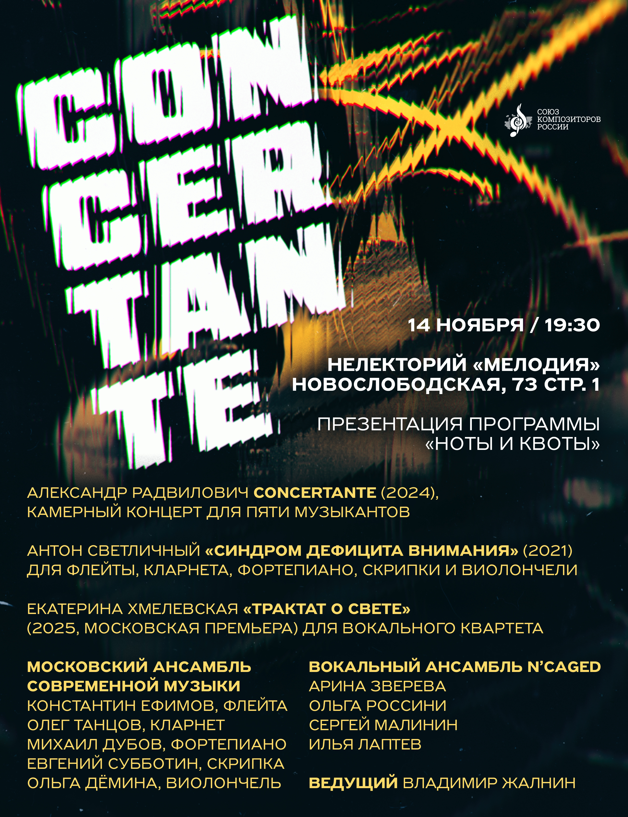14 ноября в нелектории «Мелодия» пройдет презентация творческой программы «Ноты и квоты». Концерт CONCERTANTE объединил партитуры, созданные современными авторами для МАСМ и вокального ансамбля N’Caged.