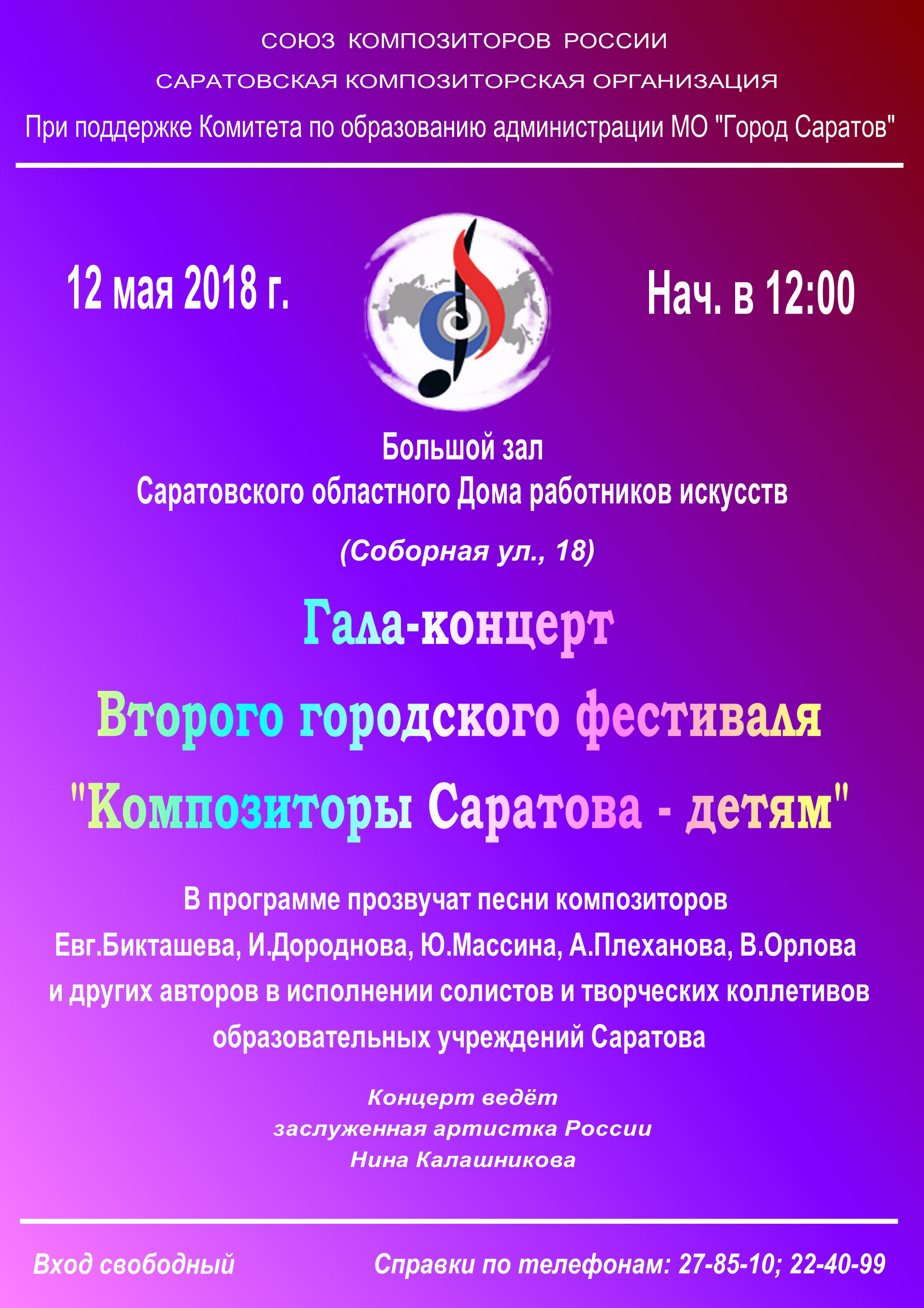 12 мая 2018 года в Большом зале Саратовского дома работников искусств состоялся гала-концерт II городского фестиваля «Композиторы Саратова – детям». Концерт прошел в рамках Всероссийского фестиваля Союза композиторов России.
