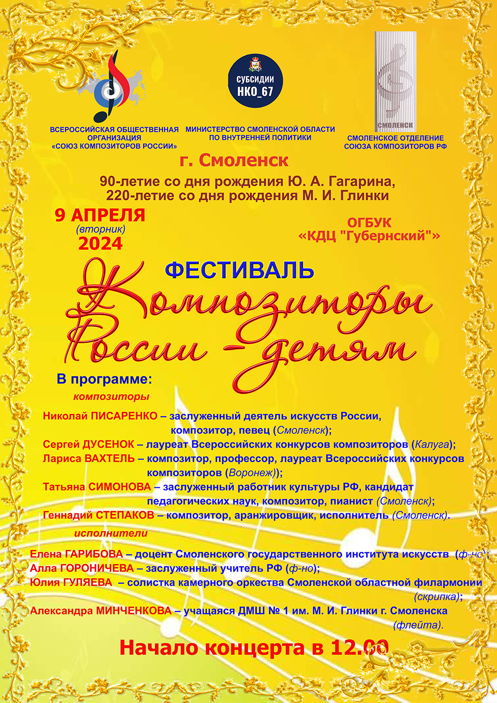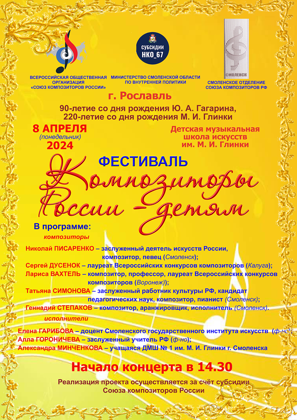 В Смоленской области при поддержке Союза композиторов России состоялся фестиваль «Композиторы России – детям». Фестиваль был приурочен к 90-летию со дня рождения Ю.А. Гагарина и 220-летию со дня рождения М.И. Глинки.