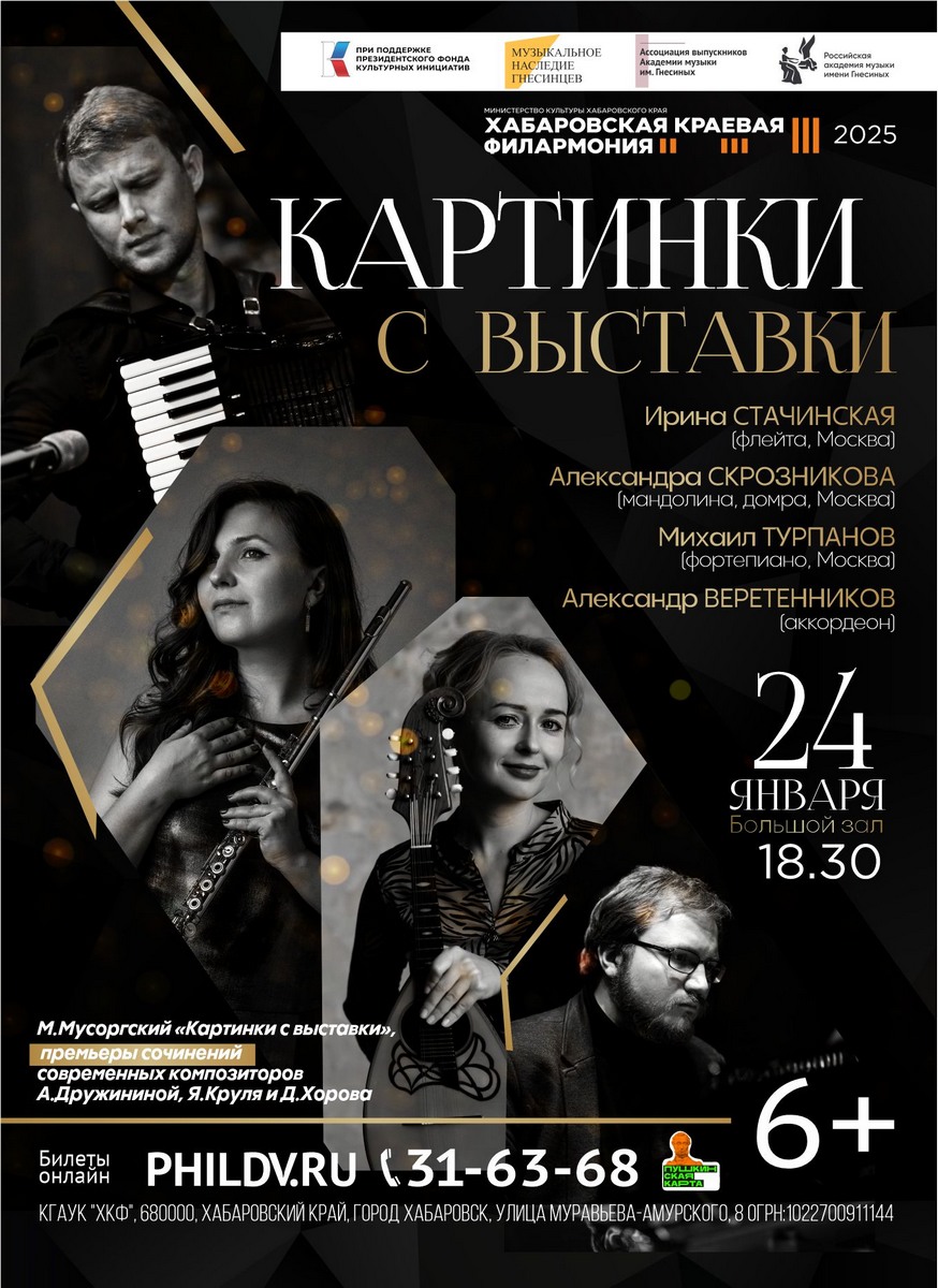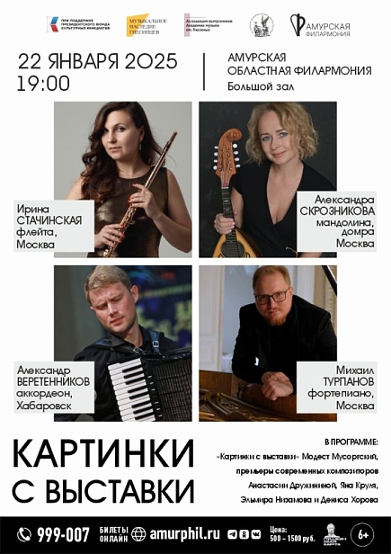 Денис Хоров: «Мне радостно, что такие великолепные музыканты, как Ирина Стачинская, Александра Скрозникова, Александр Веретенников и Михаил Турпанов, оказались открытыми к новой музыке современных российских авторов. Это не первый гастрольный тур квартета с произведениями композиторов Союза, однако в предстоящей программе музыке молодых впервые будет посвящено целое отделение. Основной идеей тура по Дальнему Востоку стал концепт "картинности". В новом музыкальном прочтении – флейта, домра, аккордеон и фортепиано – прозвучит цикл Модеста Мусоргского "Картинки с выставки". Премьеры сочинений Анастасии Дружининой "Байкальская фантазия", Яна Круля "Сияние", Эльмира Низамова "Кобанский танец" и моя пьеса "Балканский ветер", являясь программными произведениями, продолжат концепт русского классика и станут музыкальными зарисовками композиторских впечатлений».