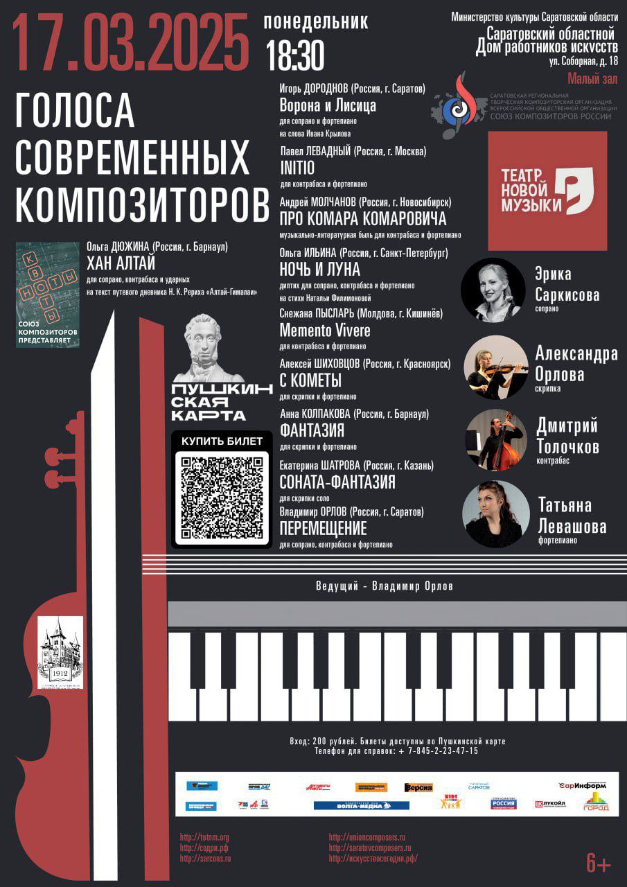 Услышать «Голоса современных композиторов» в Саратове можно будет дважды: 17 марта в 18:30 в Саратовском областном доме работников искусств и 9 апреля в 18:30 в Малом зале Саратовской консерватории
