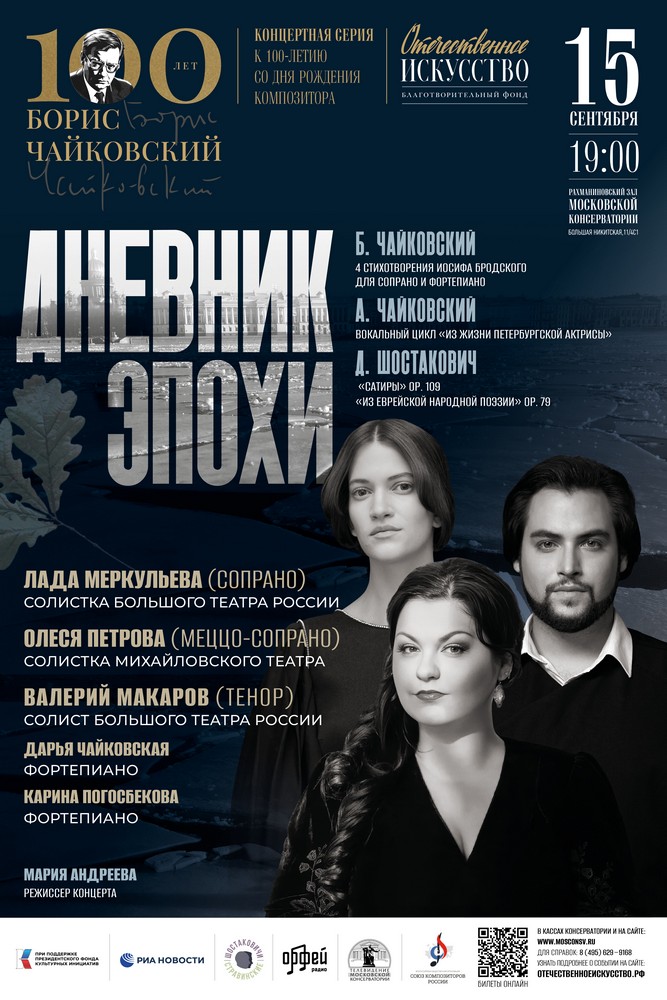 - 15 сентября, Рахманиновский зал Московской консерватории. «Дневник эпохи»: вокальные циклы Б. Чайковского, Д. Шостаковича и А. Чайковского. Солисты: Олеся Петрова (меццо-сопрано), Валерий Макаров (тенор), Лада Меркульева (сопрано).