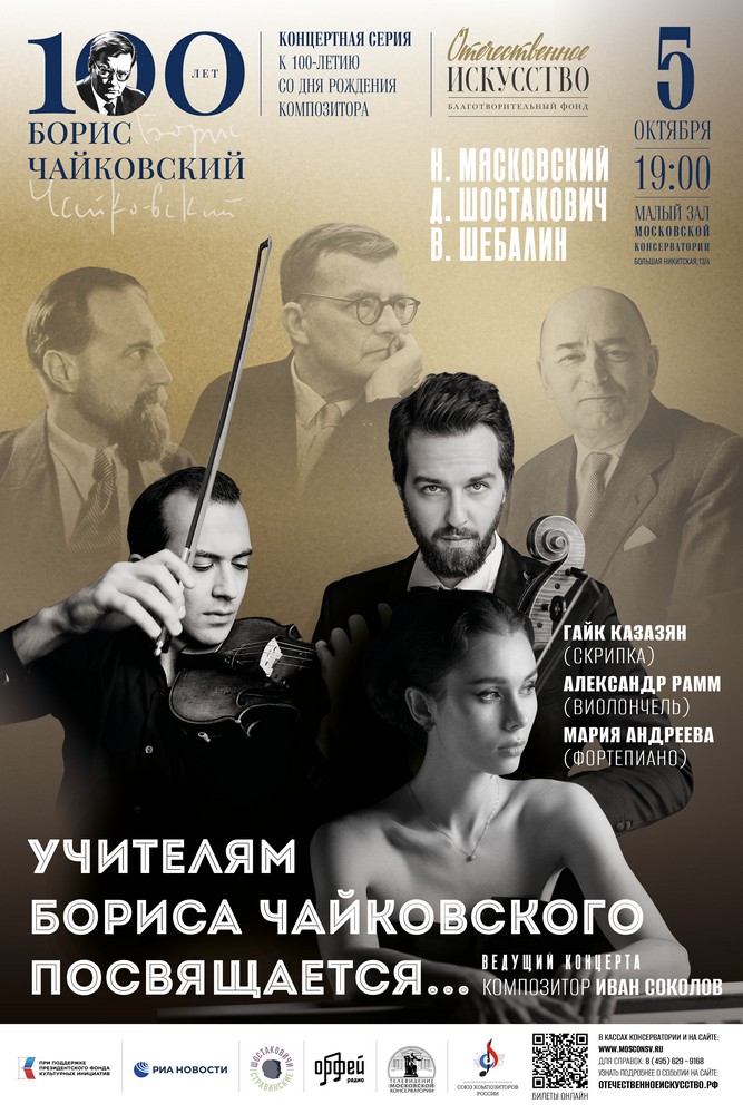 - 5 октября, Малый зал Московской консерватории. «Учителям Бориса Чайковского посвящается...». Сонаты В. Шебалина, Н. Мясковского, Д. Шостаковича и трио Б. Чайковского. Солисты: Александр Рамм (виолончель), Гайк Казазян (скрипка), Мария Андреева (фортепиано).
