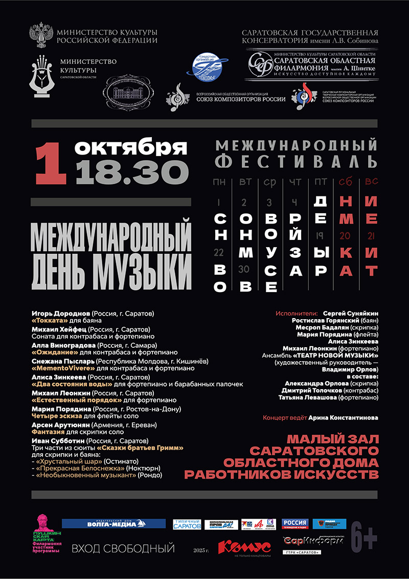 1 октября, в Международный день музыки на фестивале «Дни современной музыки в Саратове» прозвучат произведения современных композиторов из России (Игорь Дороднов, Михаил Хейфец, Алла Виноградова, Алиса Зинкеева, Михаил Леонкин, Мария Порядина, Иван Субботин), Армении (Арсен Арутюнян) и Молдовы (Снежана Пысларь). Концерт состоится в Саратовском областном доме работников искусств.
