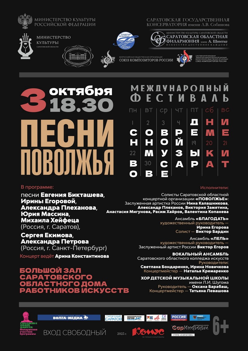 3 октября в 18:30 в Большом зале Саратовского областного дома работников искусств состоится концерт «Песни Поволжья» в рамках Международного фестиваля «Дни современной музыки в Саратове». В программе песни Евгения Бикташева, Ирины Егоровой, Александра Плеханова, Юрия Массина, Михаила Хейфеца (г. Саратов), Сергея Екимова и Александра Петрова (г. Санкт-Петербург) в исполнении солистов Саратовской областной концертной организации «Поволжье».