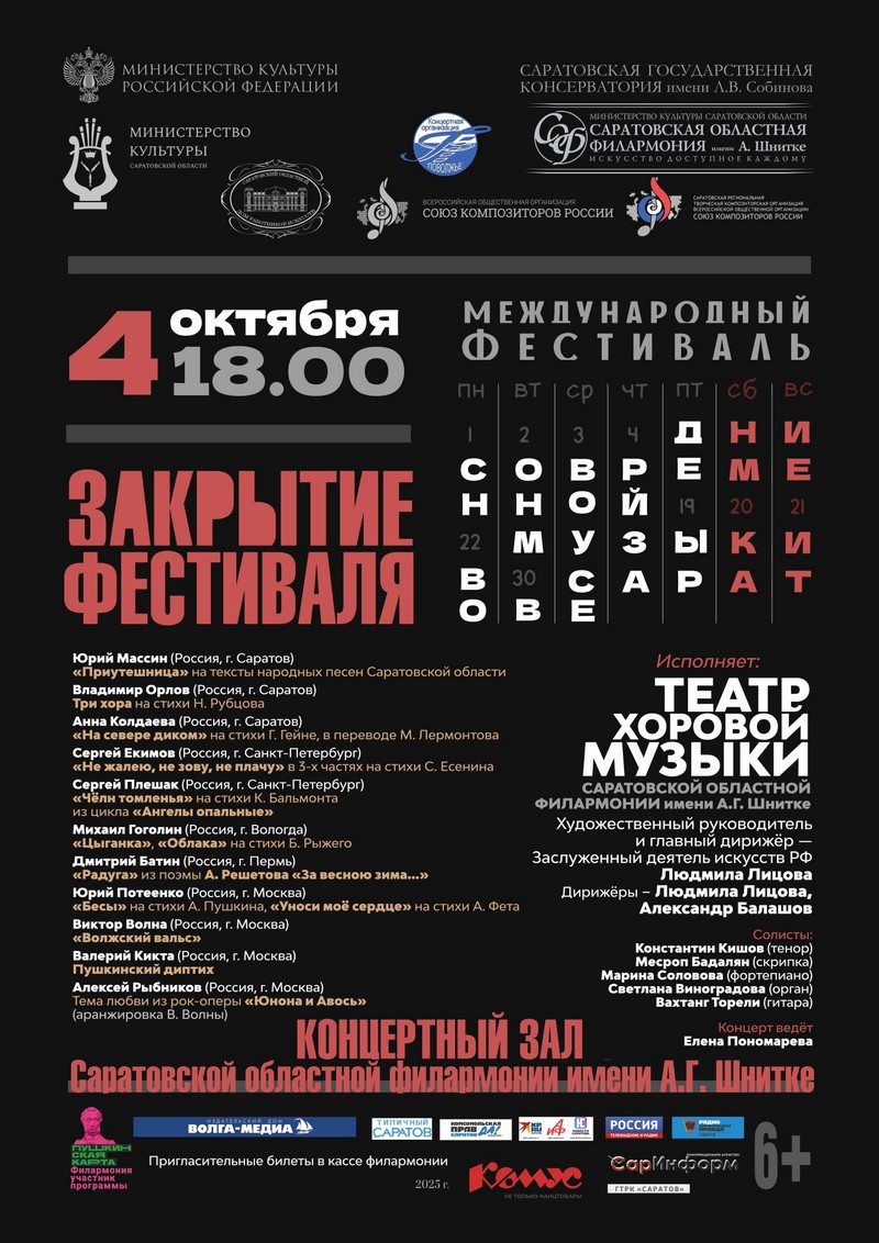 Заключительный концерт Международного фестиваля «Дни современной музыки в Саратове» состоится 4 октября в 18:00 в Саратовской областной филармонии имени А. Шнитке. В исполнении Театра хоровой музыки (художественный руководитель и главный дирижер — Заслуженный деятель искусств РФ Людмила Лицова) прозвучат хоровые произведения современных российских композиторов: Юрия Массина, Владимира Орлова, Сергея Екимова, Юрия Потеенко, Валерия Кикты и Алексея Рыбникова.