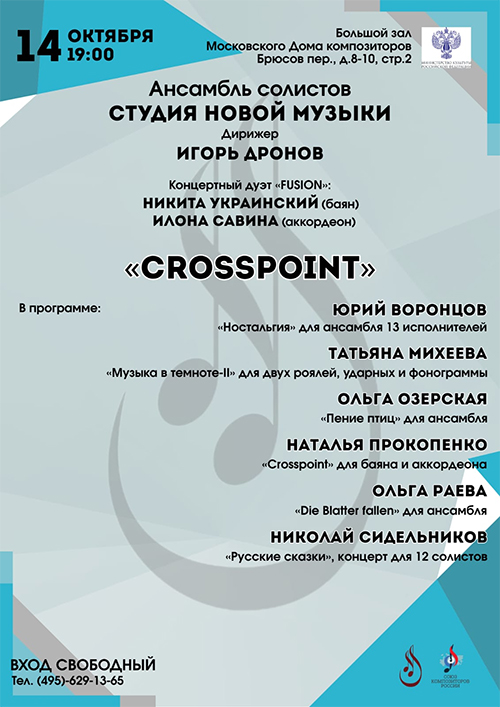 14 октября 2024 года в Большом зале Московского Дома композиторов в рамках 45-го Международного фестиваля современной музыки «Московская осень» состоится концерт «CROSSPOINT». В программе вечера примет участие Ансамбль солистов «Студия новой музыки» под руководством дирижера Игоря Дронова и виртуозный концертный дуэт «FUSION» в составе Никиты Украинского (баян) и Илоны Савиной (аккордеон).