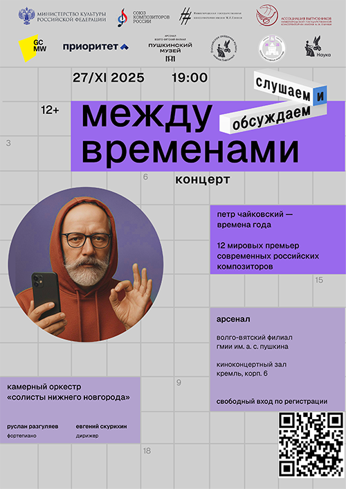 27 ноября в «Арсенале» (Волго-Вятский филиал ГМИИ имени А. С. Пушкина) пройдет концерт «Между временами», отражающий диалог современных композиторов с музыкальной традицией П. И. Чайковского. В первом отделении прозвучит одноимённый фортепианный цикл Чайковского в исполнении Руслана Разгуляева; во втором — состоится премьера коллективного сочинения, авторами которого стали Александр Перов, Лидия-Мария Кошевая, Денис Присяжнюк, Фархад Бахтияри, Карина Барас, Марк Булошников, Анна Ромашкова, Роман Цыпышев, Алина Мухаметрахимова, Ольга Веденкина, Артур Зобнин, Антон Светличный. Каждая часть нового сочинения представляет собой музыкальную рефлексию на одну из пьес цикла Чайковского.