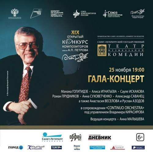 25 ноября 2025 г. в 19:00 в Санкт-Петербургском Театре музыкальной комедии состоится Гала-концерт XIX Открытого конкурса композиторов имени А.П. Петрова.
