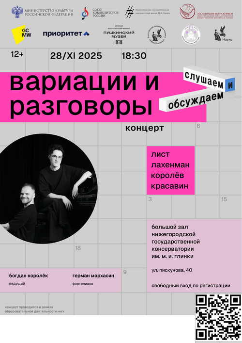 Впервые в Нижнем выступают пианист, лауреат международных конкурсов Герман Мархасин и ведущий Богдан Королёк (нижегородским зрителям он известен как соавтор спектакля «Пиковая дама. Балет»). Их фирменный жанр – концерт с разговорами, старая и новая академическая музыка и неакадемический рассказ о ней. Именно так устроены концерты «Прекрасная музыка», которые проходят в Екатеринбурге, Петербурге, Перми. В рамках проекта «Слушаем и обсуждаем» Мархасин и Королёк представляют вечер вариаций и транскрипций – арки и рифмы, перекинутые через два века. Во все времена композиторы возвращаются к музыке прошлого и традиционным жанрам – даже самые радикальные авторы. Ференц Лист пишет багатель, но без тональности, а Юрий Красавин в цикле багателей превращает пианиста в актера. Лист и Анатолий Королёв собирают мозаику русских народных песен. Маршал немецкой новой музыки Хельмут Лахенман, чье 90-летие отмечает этот концерт, отправляет Шуберта в лабиринт кривых зеркал, а Листа (и многих других) – на судьбоносный марш.