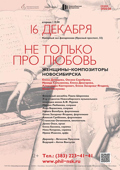 16 декабря на концерте «Не только про любовь» в камерном зале Новосибирской филармонии прозвучит музыка композиторов Новосибирска: Елены Захаровой-Ягодиной, Оксаны Серебровой, Ираиды Сальниковой, Елены Джагаровой, Александры Канторович, Елены Демидовой и Юлии Пискуновой.