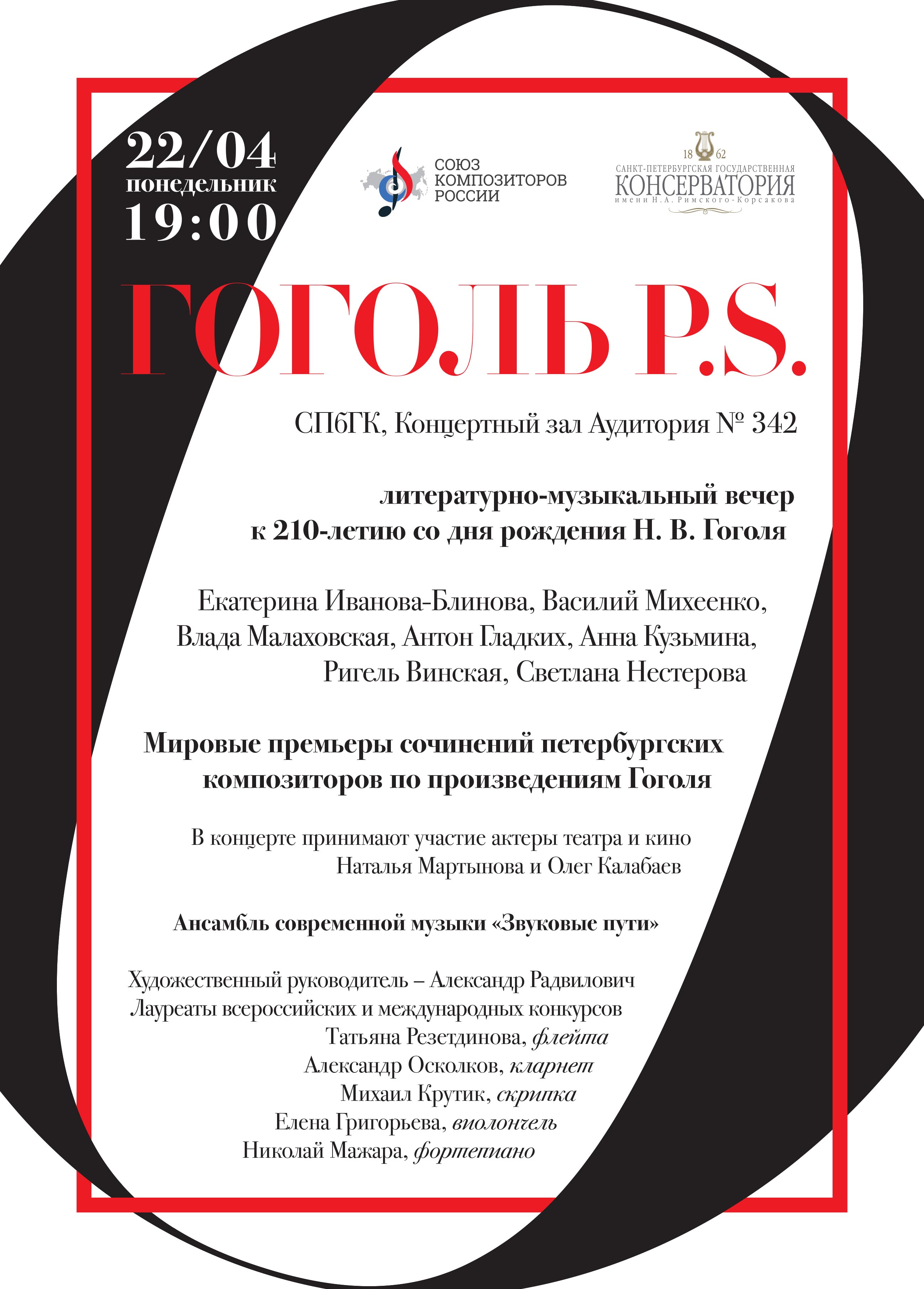 Гоголь P.S. – это история жизни писателя, рассказ о которой неразрывно переплетается с судьбами его персонажей. Слушателей концерта ожидает путешествие в мистический мир гоголевской прозы. В роли Вергилия выступит музыка современных композиторов Санкт-Петербурга: Екатерины Ивановой-Блиновой, Василия Михеенко, Влады Малаховской, Антона Гладких, Анны Кузьминой, Ригель Винской и Светланы Нестеровой, в этот вечер прозвучат семь мировых премьер, написанных специально для этого проекта. «В последние годы наметилась тенденция – среди интересных композиторов появилось много женских имен. Из семи авторов “Гоголь P.S.” – пять представительниц этой творческой профессии», – отметила Карина Абрамян, генеральный директор Союза композиторов России.