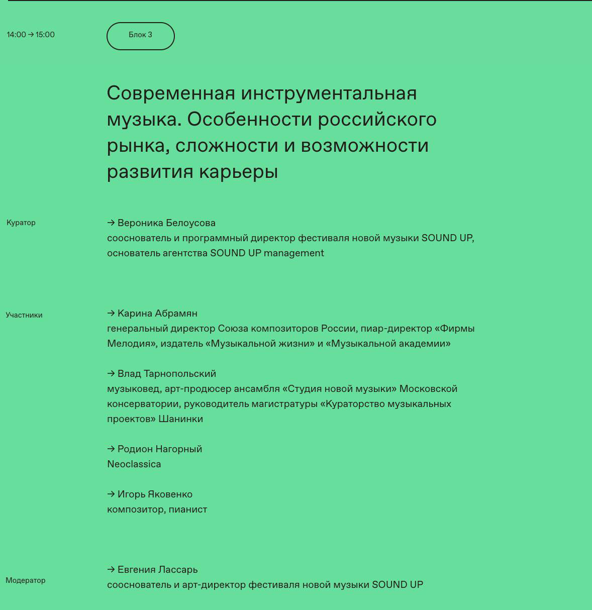 Основные темы – «Особенности российского рынка, сложности и возможности развития карьеры», «Как добиться успеха. DIY инструментарий композитора и музыканта», «Союз композиторов России: обновленная платформа поддержки российских композиторов».