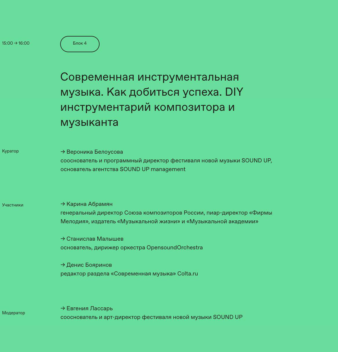 Куратор – сооснователь и программный директор фестиваля новой музыки SOUND UP Вероника Белоусова.