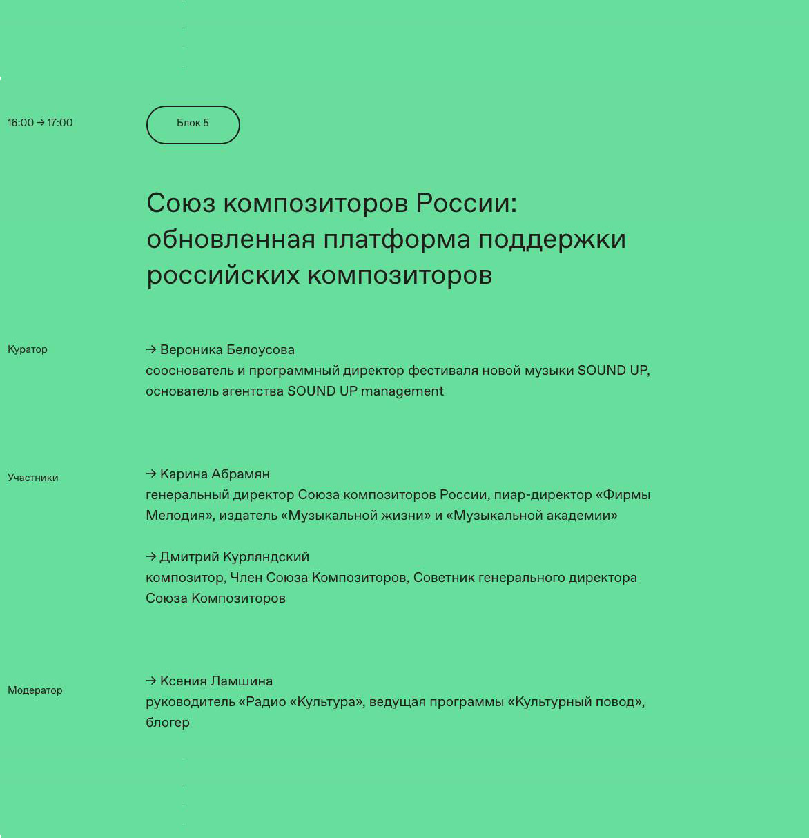 Это событие ежегодно объединяет представителей музыкальной индустрии и способствует обсуждению значимых профессиональных вопросов из мира современной музыки. Союз композиторов на конференции представят генеральный директор Карина Абрамян и Дмитрий Курляндский, композитор Союза и музыкальный руководитель Электротеатра Станиславский.