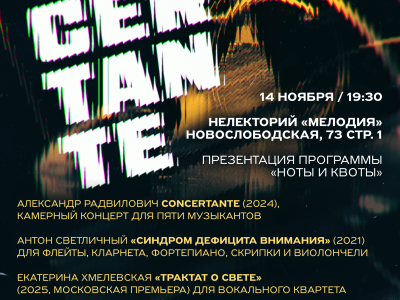 14 ноября в нелектории «Мелодия» пройдет презентация творческой программы «Ноты и квоты». Концерт CONCERTANTE объединил партитуры, созданные современными авторами для МАСМ и вокального ансамбля N’Caged.