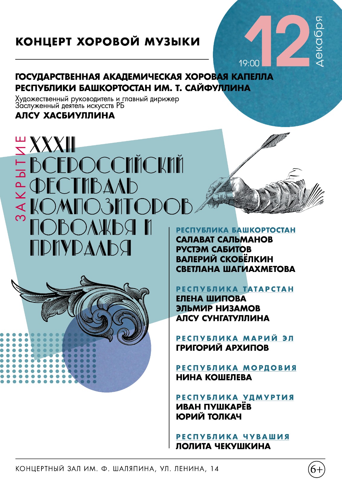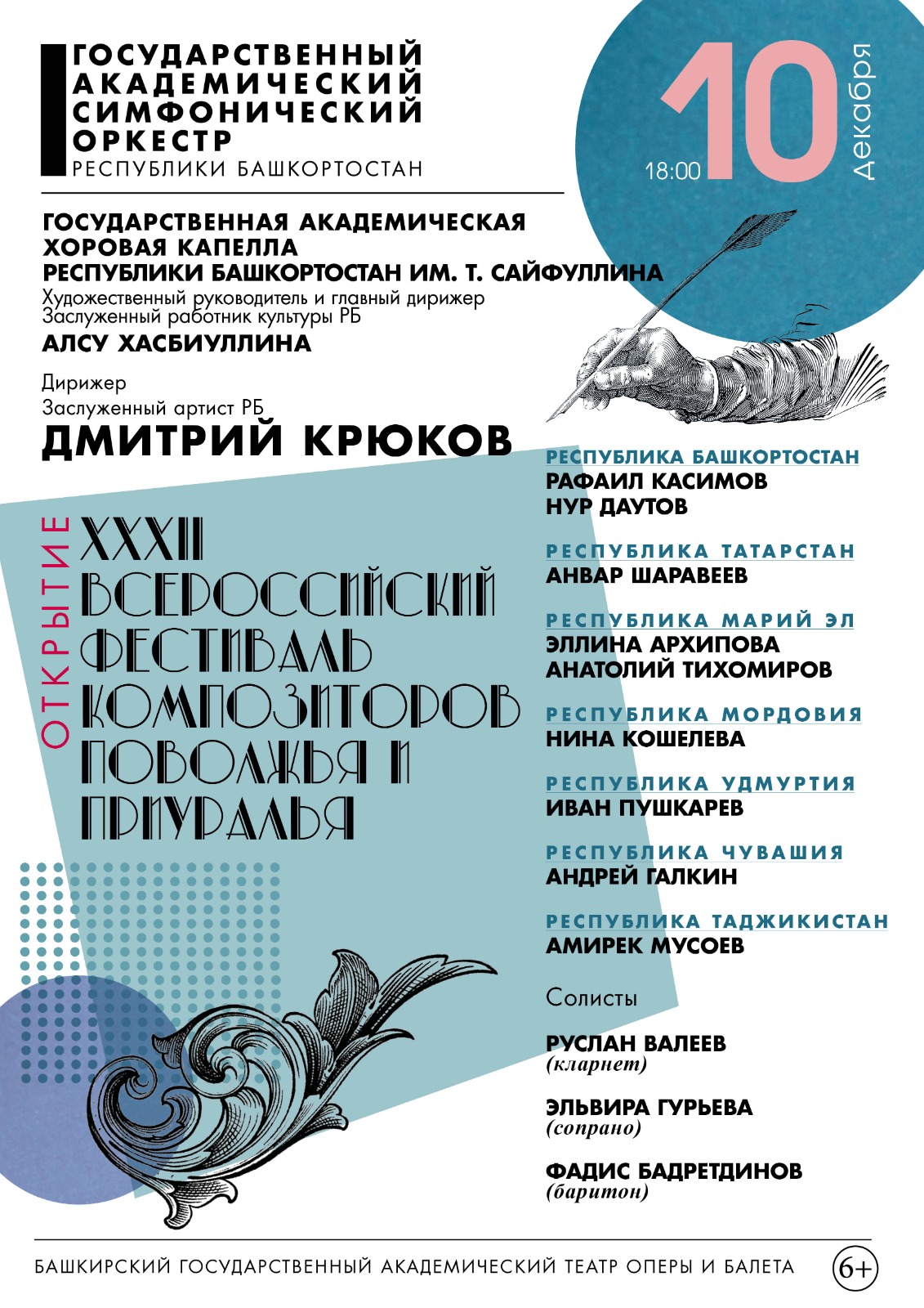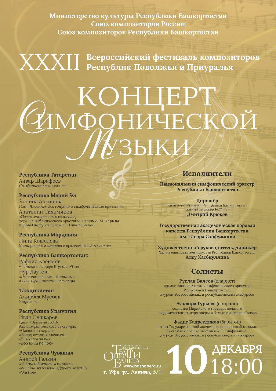 В Уфе с 10 по 14 декабря пройдет XXXII Фестиваль композиторов Поволжья и Приуралья. На фестиваль приглашены композиторы из Таджикистана, Татарстана, Удмуртии, Марий Эл, Чувашии, Мордовии.