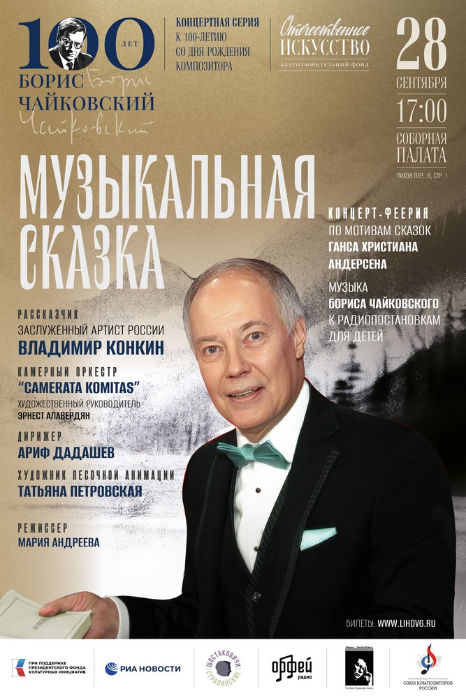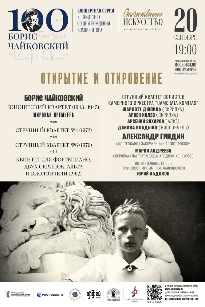 Подробности и билеты: https://xn--b1aahabavqyafge6ahbaedls9e.xn--p1ai/boris-chajkovskij-100-let/