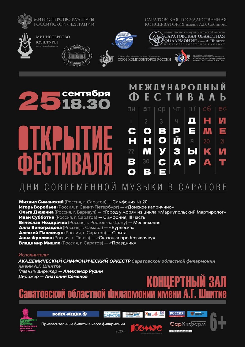 25 сентября в 18:30 в Саратовской областной филармонии имени А.Г. Шнитке состоится открытие фестиваля. В программе концерта — симфонические произведения отечественных композиторов в исполнении академического симфонического оркестра Саратовской филармонии. Главный дирижер — Александр Рудин.