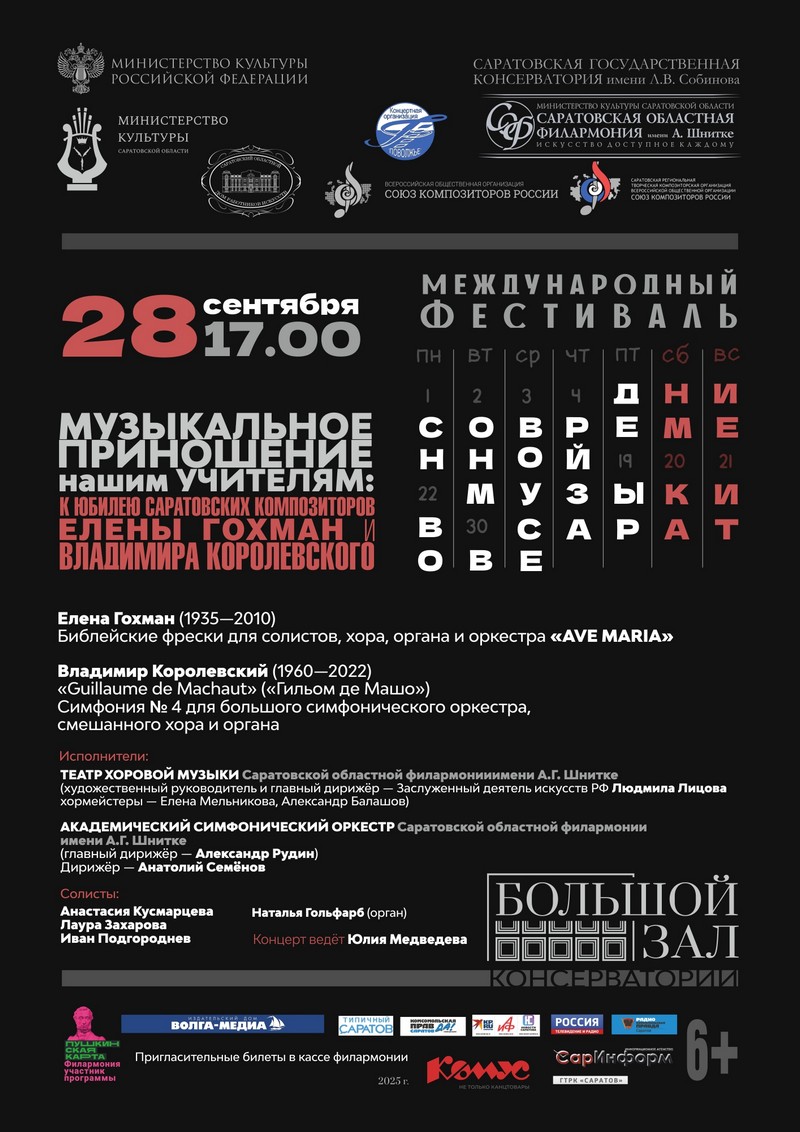 Второй концерт Международного фестиваля «Дни современной музыки в Саратове» посвящен памяти двум выдающимся композиторам и педагогам Саратовской консерватории — Елене Гохман и Владимиру Королевскому. В программе концерта их два монументальных сочинения: библейские фрески «Ave Maria» Елены Гохман и Симфония № 4 «Гильом де Машо» Владимира Королевского. Концерт состоится в Большом зале Саратовской государственной консерватории имени Л.В. Собинова 28 сентября в 17:00.