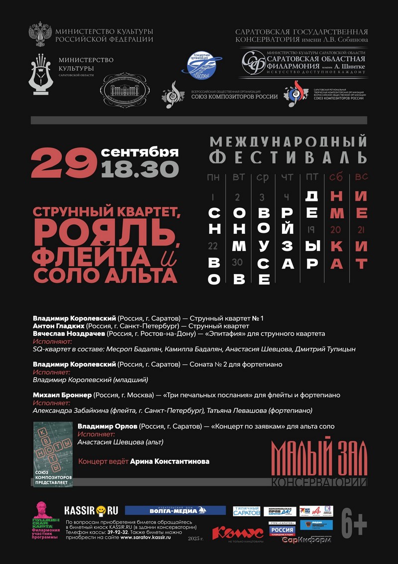 29 сентября в 18:30 Малом зале Саратовской консерватории состоится концерт «Струнный квартет, рояль, флейта и соло альта».В программе концерта сочинения Владимира Орлова (в рамках программы Союза композиторов России «Ноты и квоты»), Владимира Королевского, Антона Гладких, Вячеслава Ноздрачева, Михаила Броннера. В рамках фестиваля в Саратовской консерватории состоится лекция «Сольфеджио на материале музыки сибирских композиторов» Ольги Дюжиной — композитора, председателя Алтайского регионального отделения Союза композиторов России, члена Сибирского международного центра современного музыкального искусства.