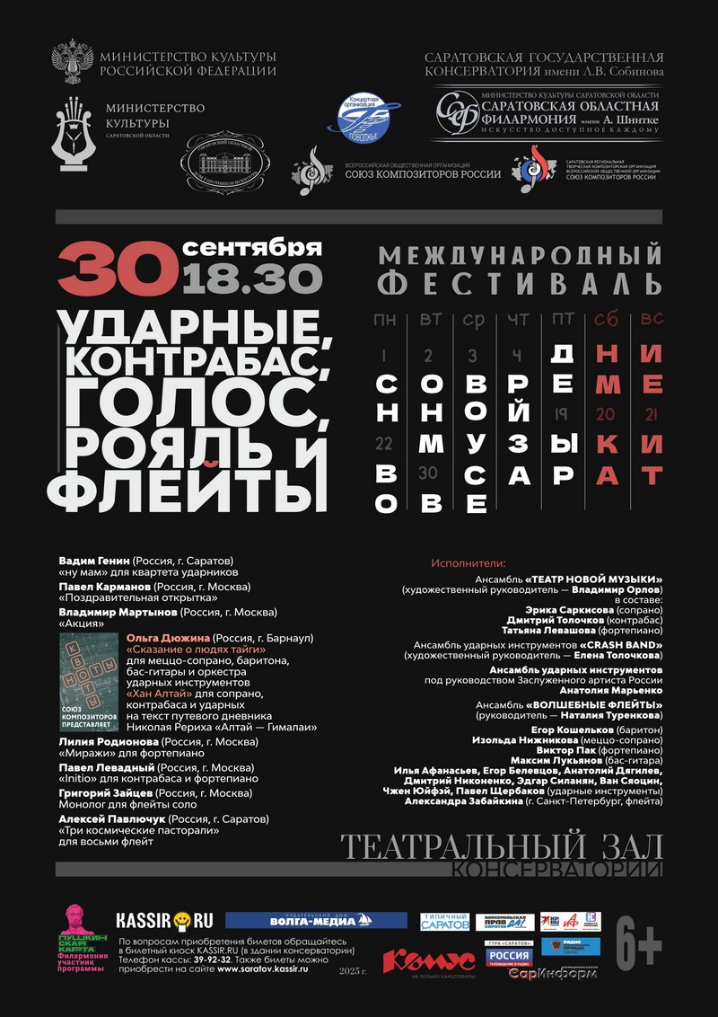 30 сентября в 18:30 Театральном зале Саратовской консерватории состоится концерт «Ударные, контрабас, голос, рояль и флейты». В программе произведения Владимира Мартынова, Павла Карманова, Павла Левадного, Лилии Родионовой, Григория Зайцева, Ольги Дюжиной, Алексея Павлючука и Вадима Генина.
