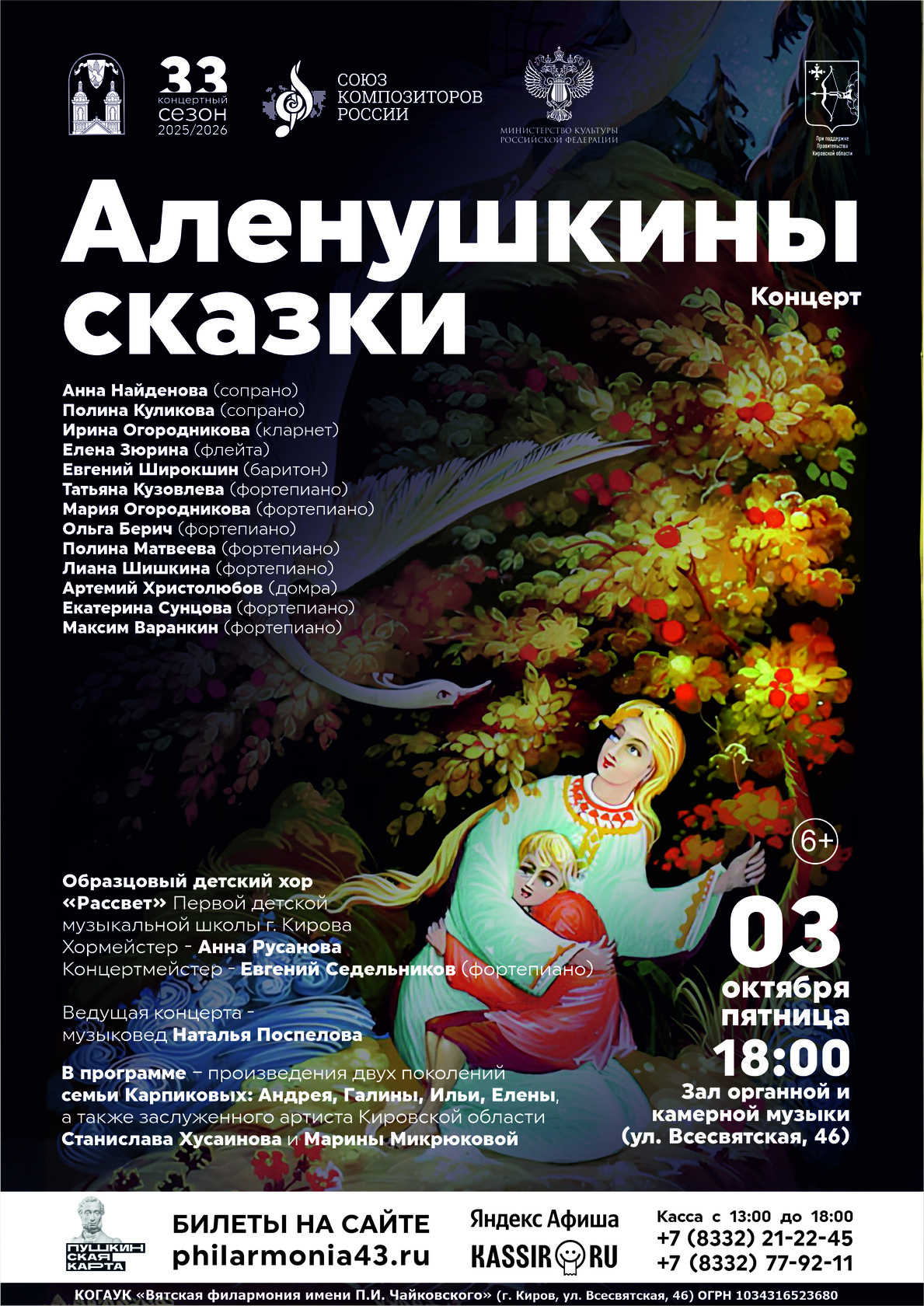 3 октября в Зале органной и камерной музыки Вятской филармонии состоится концерт «Аленушкины сказки. Музыка вятских композиторов для детей». Слушателям предстоит увлекательное путешествие в мир ярких музыкальных образов, навеянных народными и литературными сказками, лирикой русской поэзии и творческим воображением современных авторов, членов Кировского отделения Союза композиторов России.