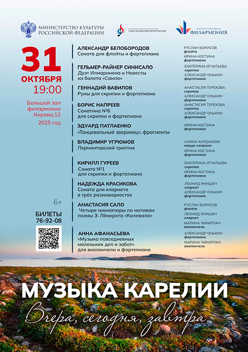31 октября в 19:00 в Большом зале Карельской государственной филармонии состоится масштабный концерт, посвященный музыкальному наследию композиторов Карелии. Концерт пройдет при поддержке Министерства культуры России и Союза композиторов России.