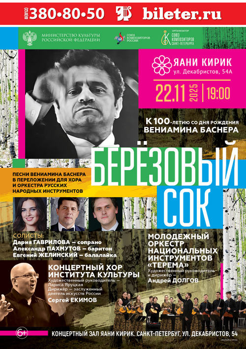 Вениамин Баснер - автор музыки всемирно известных песен «Берёзовый сок», «Белой акации гроздья душистые», «С чего начинается Родина», «На безымянной высоте», а также к кинофильмам «Щит и меч», «Полосатый рейс», «Дни Турбиных» и других. В 2025 году празднуется 100 лет со дня рождения маэстро.