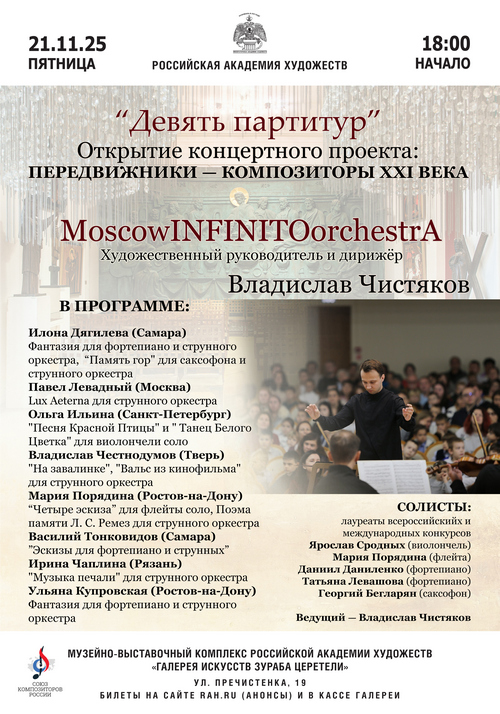 21 ноября в Музейно-выставочном комплексе Российской академии художеств «Галерея искусств Зураба Церетели» (ул. Пречистенка, 19) состоится открытие концертного проекта «Передвижники – композиторы XXI века». В рамках вечера «Девять партитур» прозвучат сочинения российских авторов из разных городов страны.