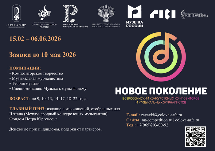 С 15 февраля по 10 мая 2026 года при поддержке Союза композиторов России и Минкультуры России проходит заочный тур VIII Всероссийского конкурса юных композиторов и музыкальных журналистов «Новое поколение». К участию приглашаются дети и молодёжь в возрасте до 22 лет (на 15 февраля 2026 года), проявляющие способности в области композиции, музыкальной журналистики и теории музыки.